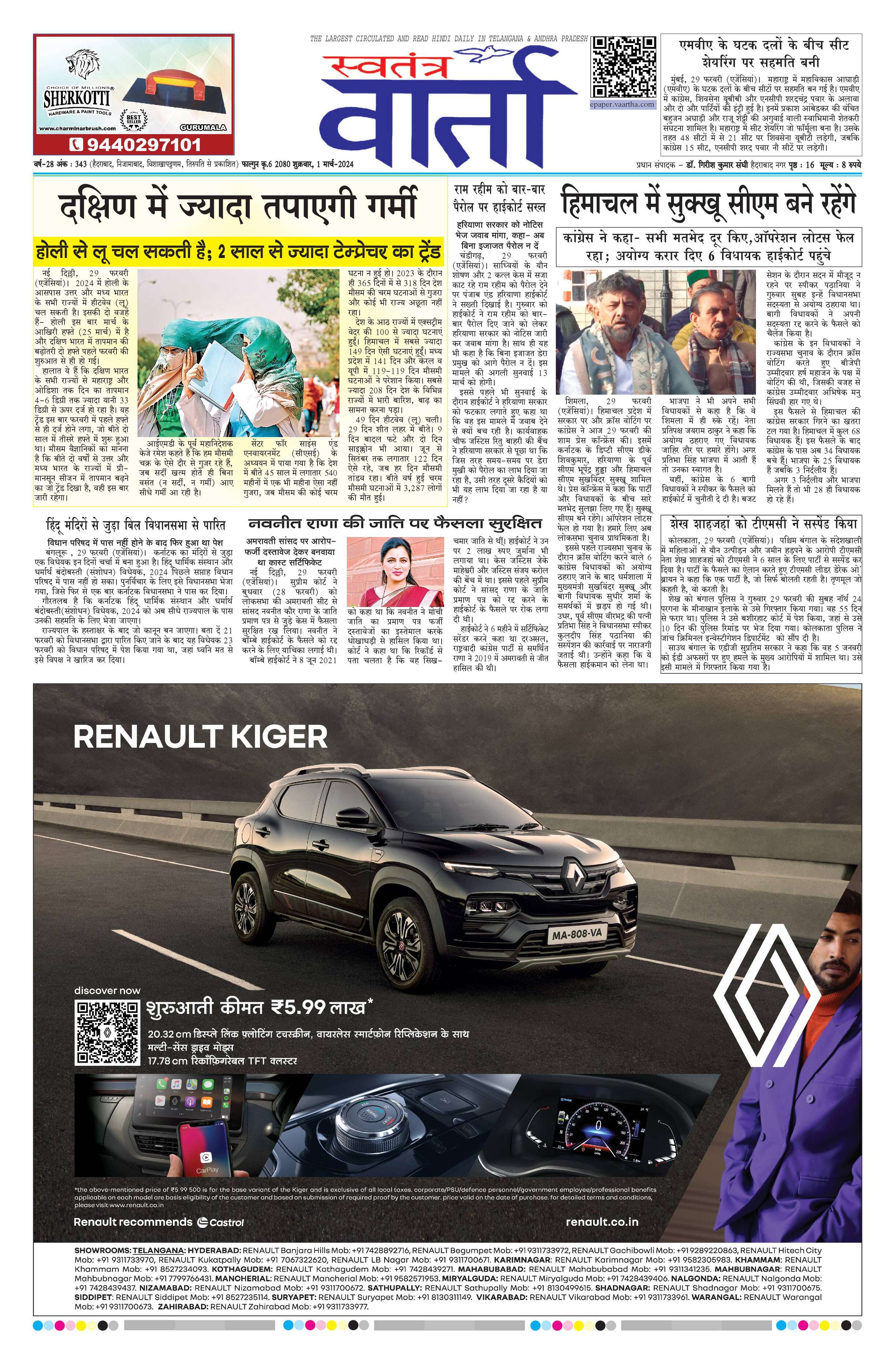 Swatantra Vaartha - 01 Mar 2024 - - Page 1