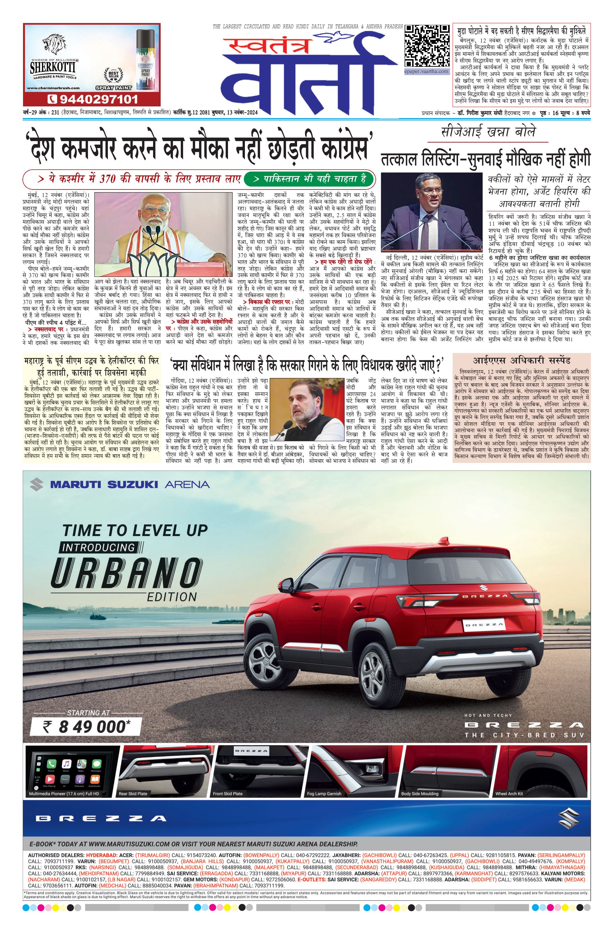 Swatantra Vaartha - 13 Nov 2024 - - Page 1