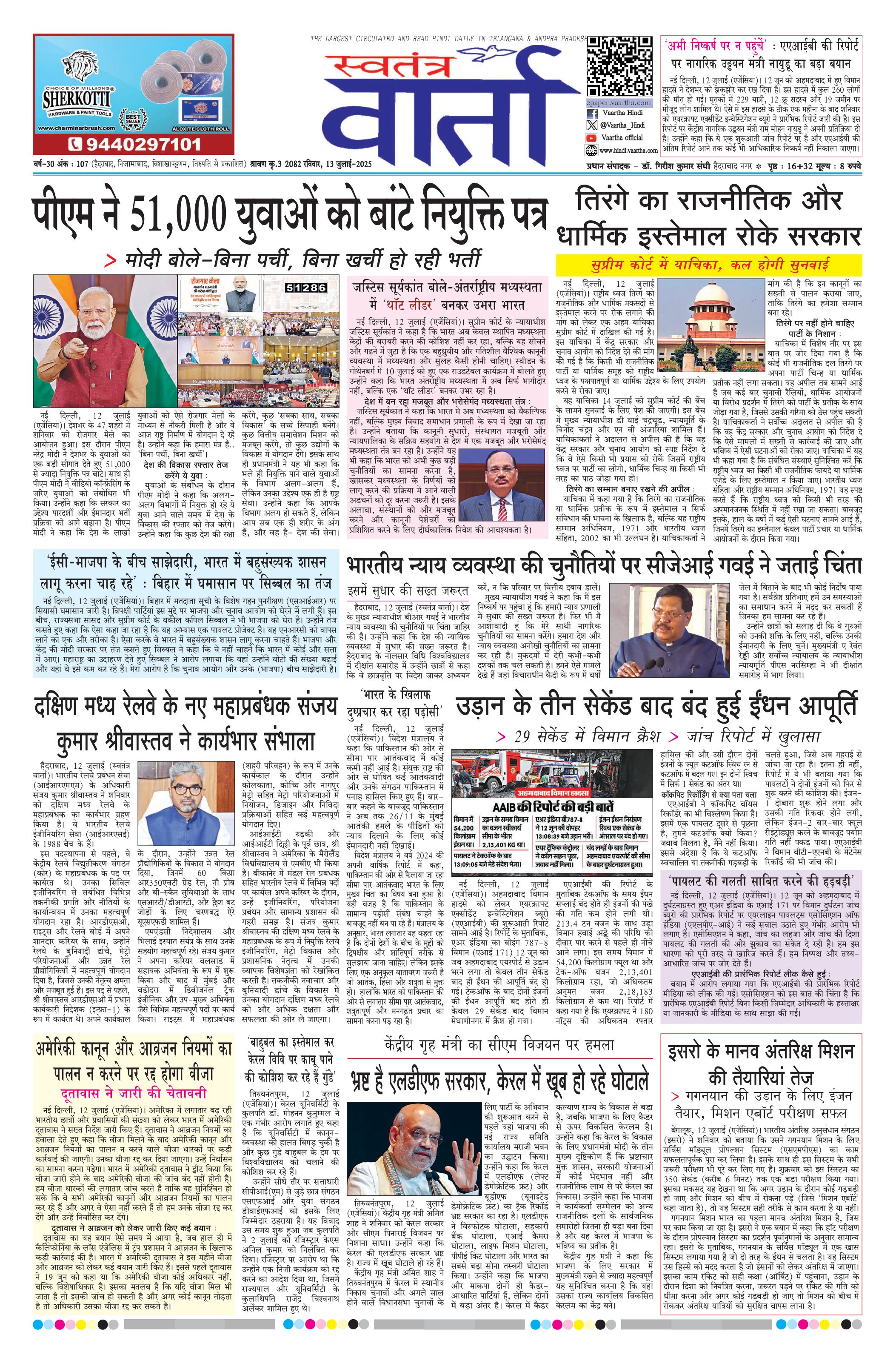 Swatantra Vaartha - 13 Jul 2025 - - Page 1