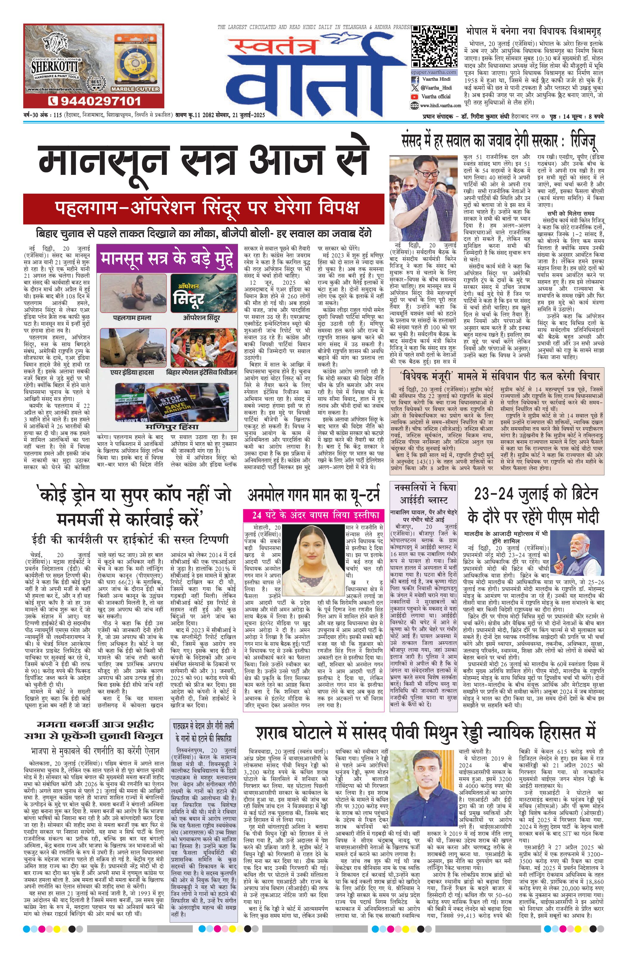 Swatantra Vaartha - 21 Jul 2025 - - Page 1