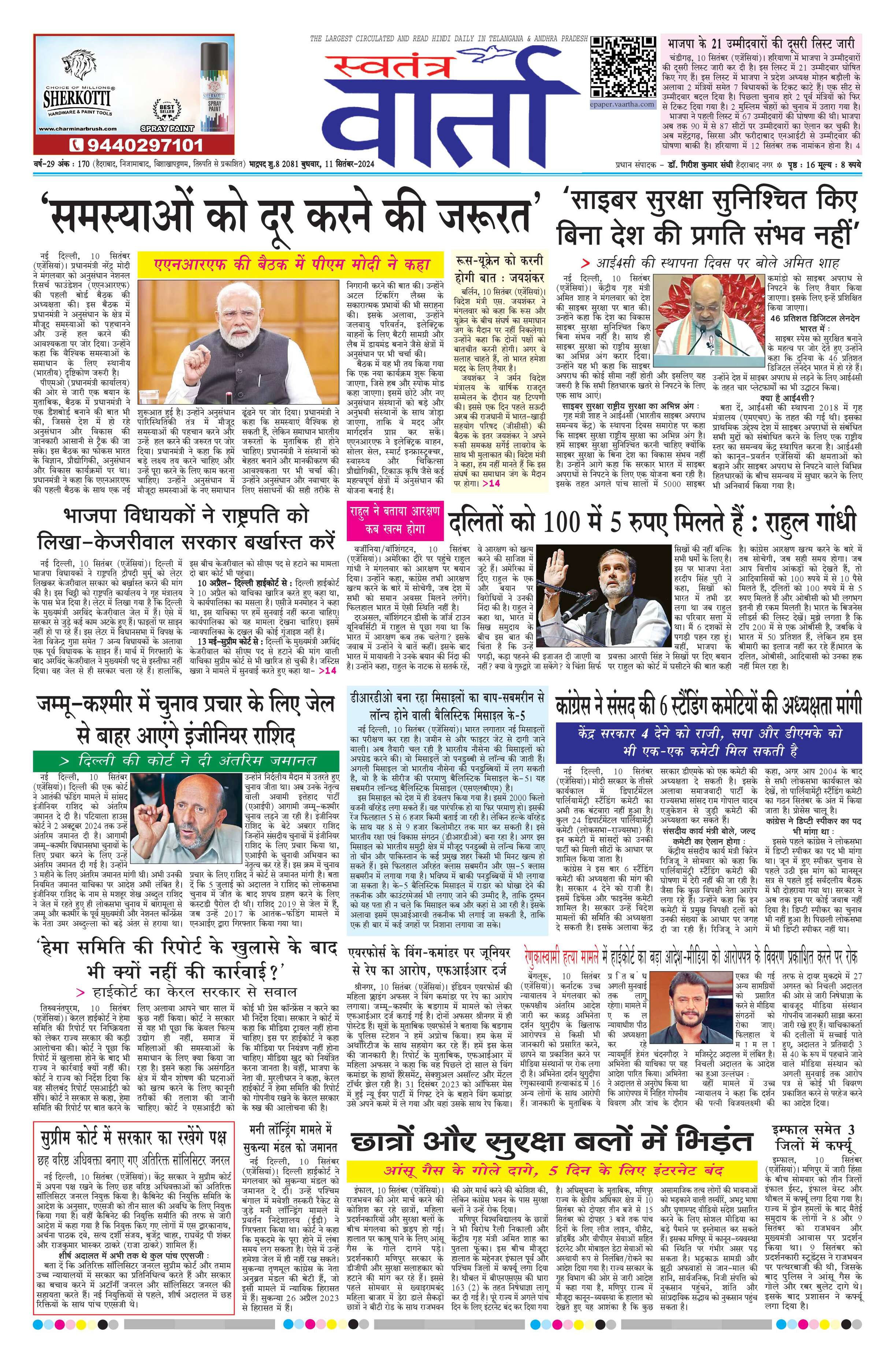 Swatantra Vaartha - 11 Sep 2024 - - Page 1