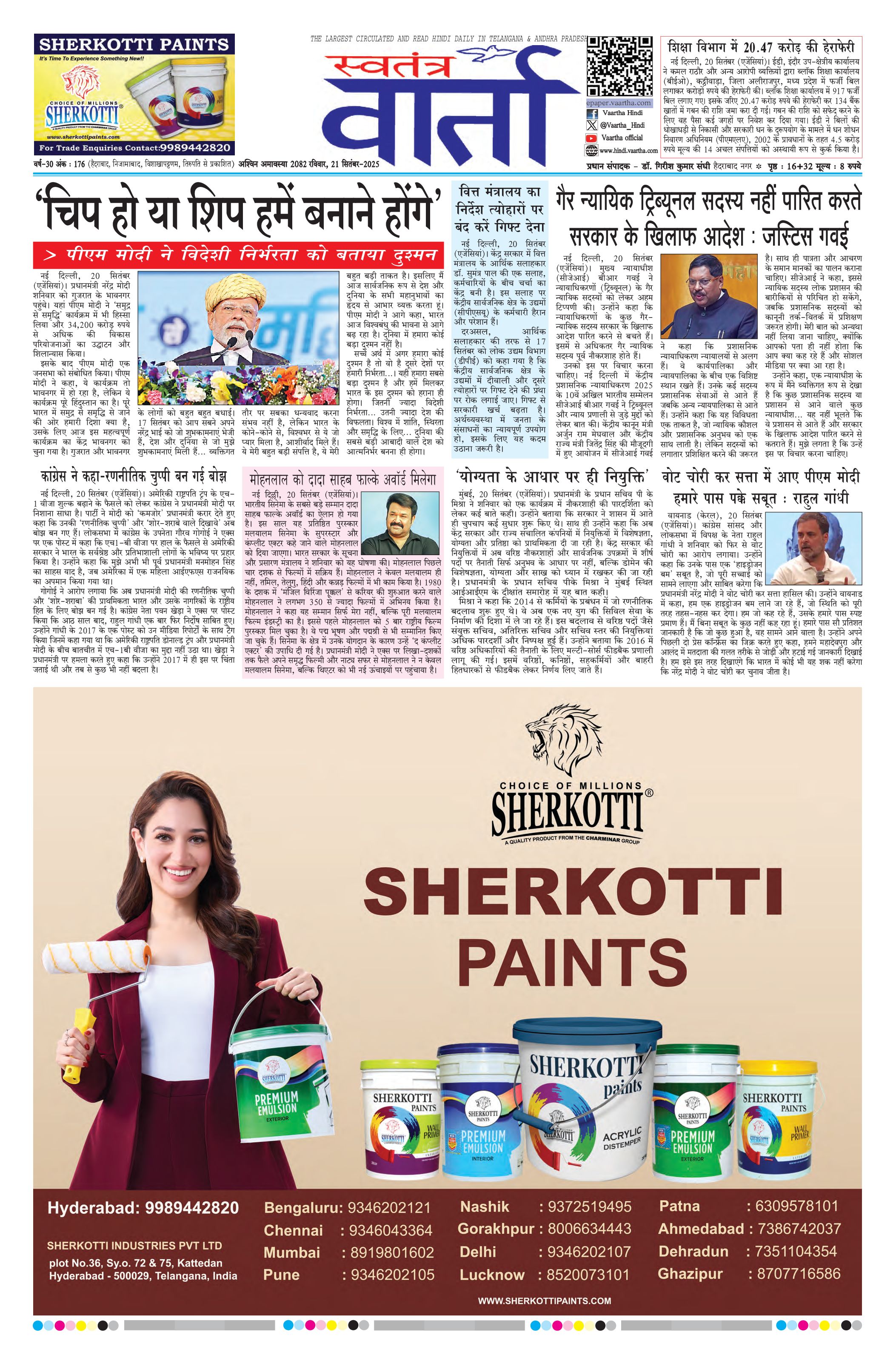 Swatantra Vaartha - 21 Sep 2025 - - Page 1