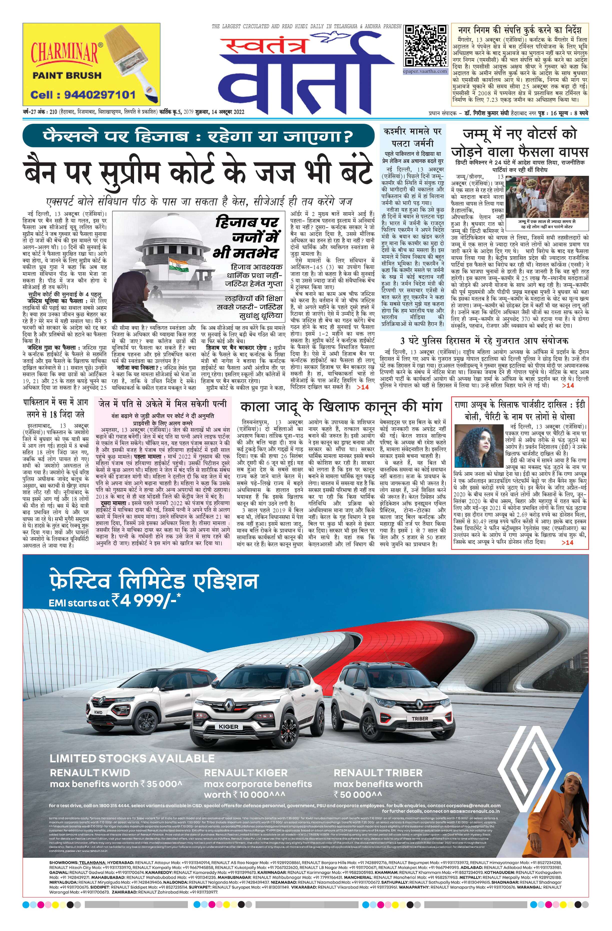 Swatantra Vaartha - 14 Oct 2022 - - Page 1