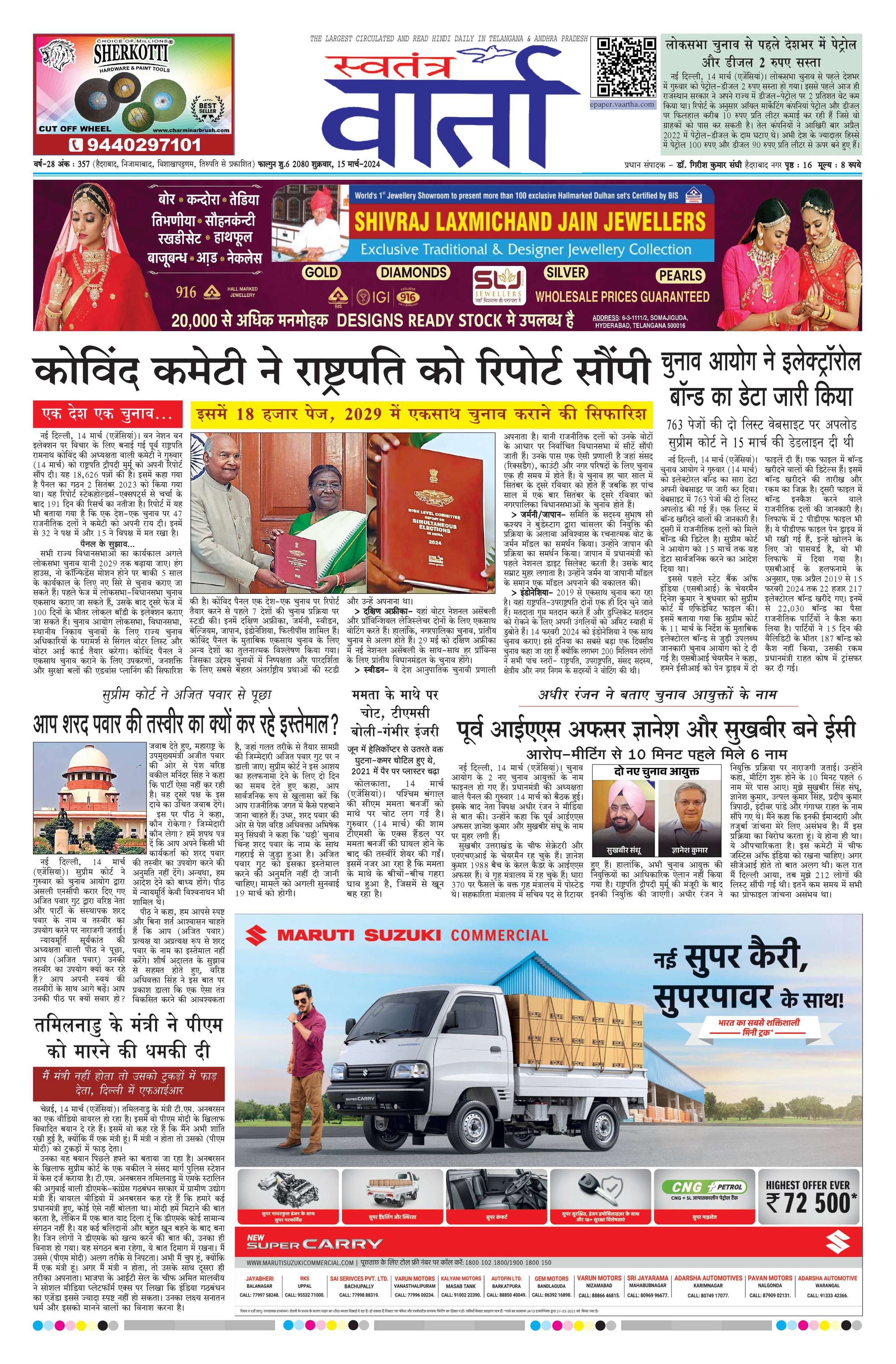 Swatantra Vaartha - 15 Mar 2024 - - Page 1