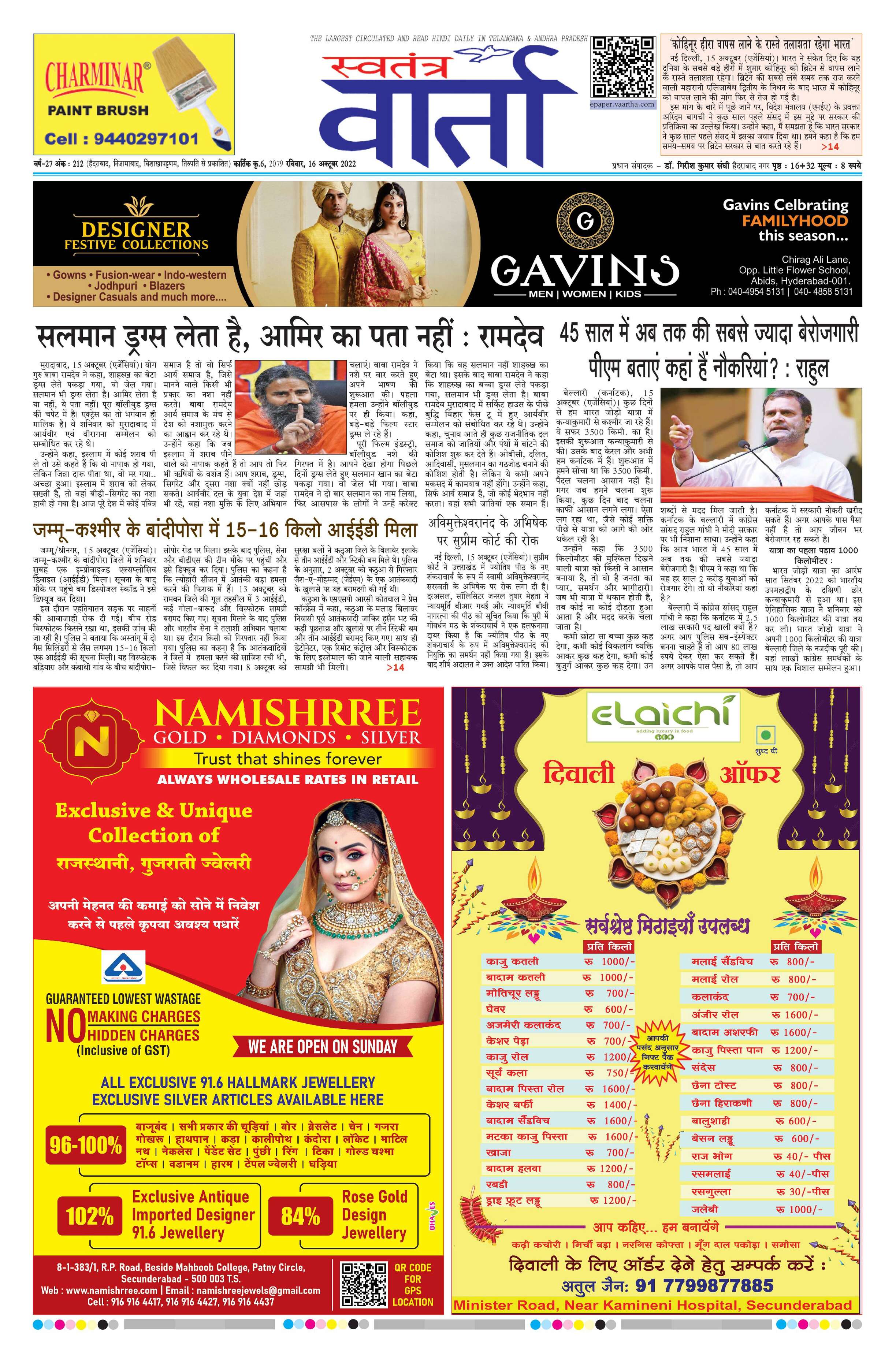 Swatantra Vaartha - 16 Oct 2022 - - Page 1