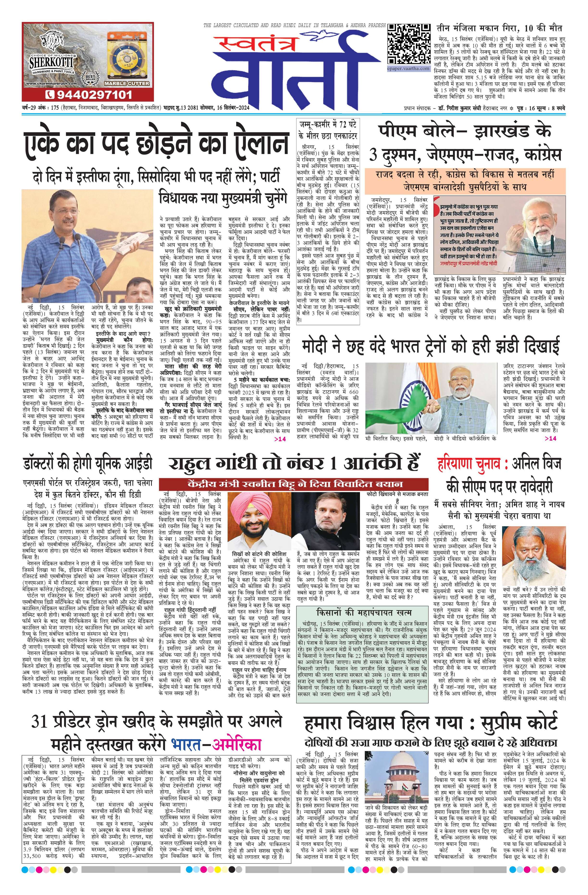 Swatantra Vaartha - 16 Sep 2024 - - Page 1