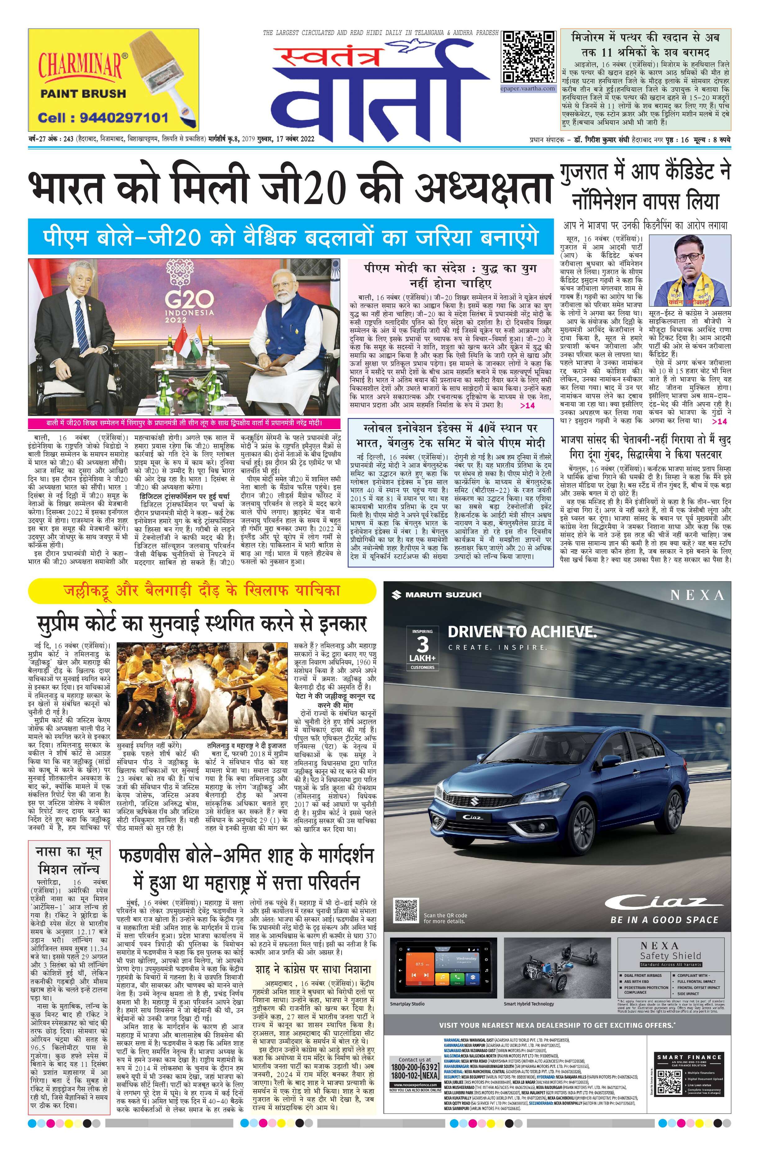 Swatantra Vaartha - 17 Nov 2022 - - Page 1