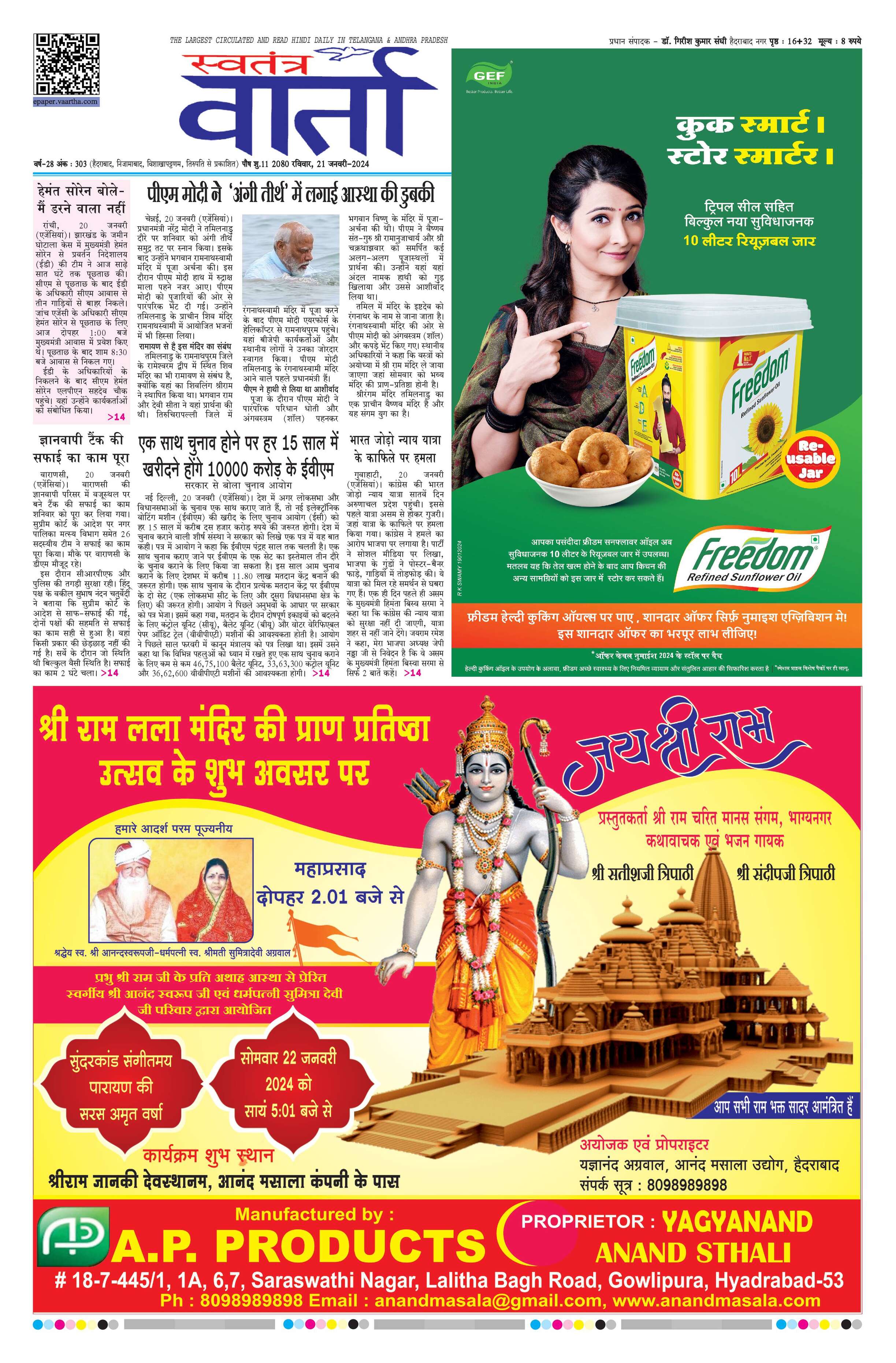 Swatantra Vaartha - 21 Jan 2024 - - Page 1