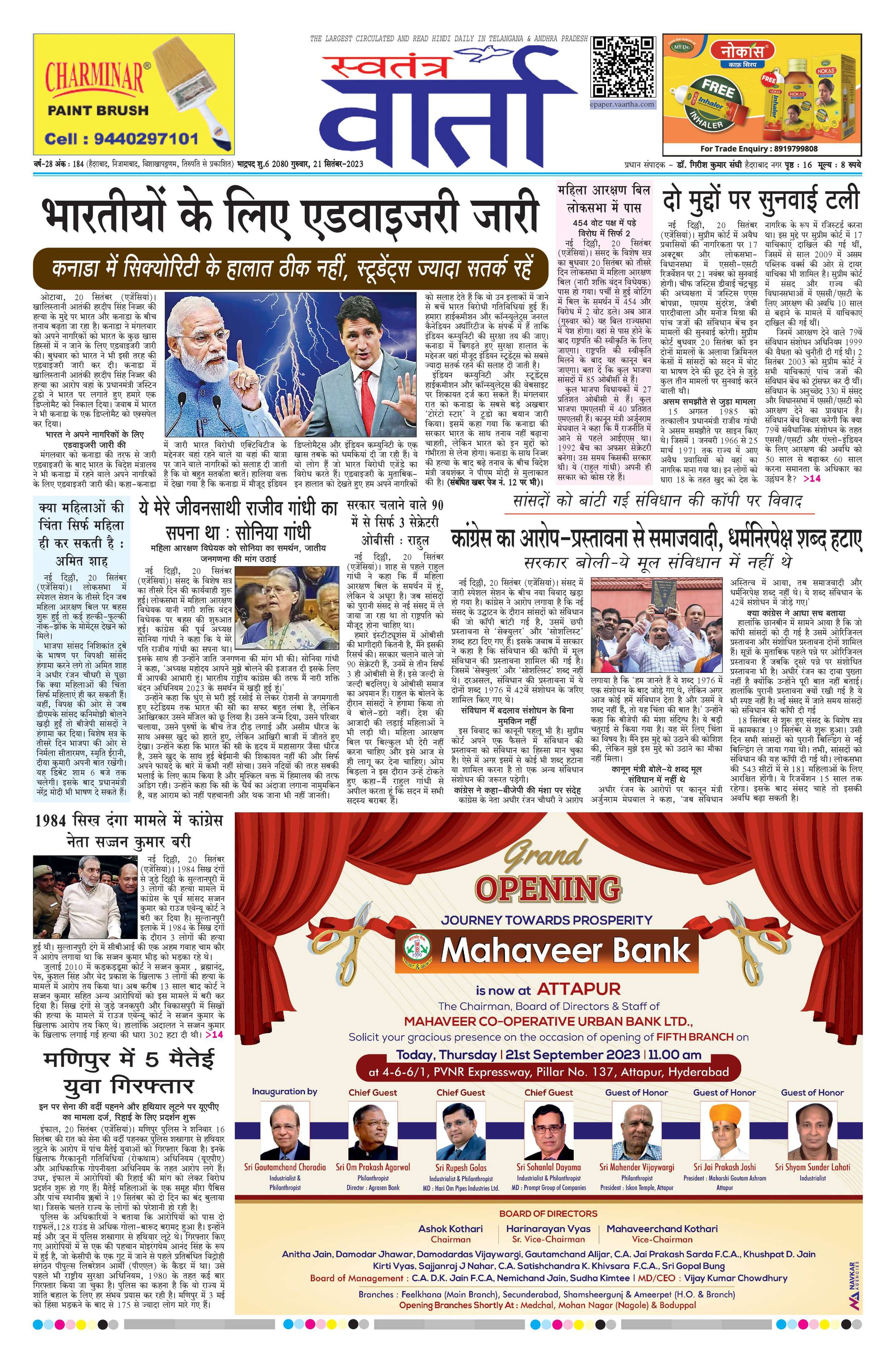 Swatantra Vaartha - 21 Sep 2023 - - Page 1