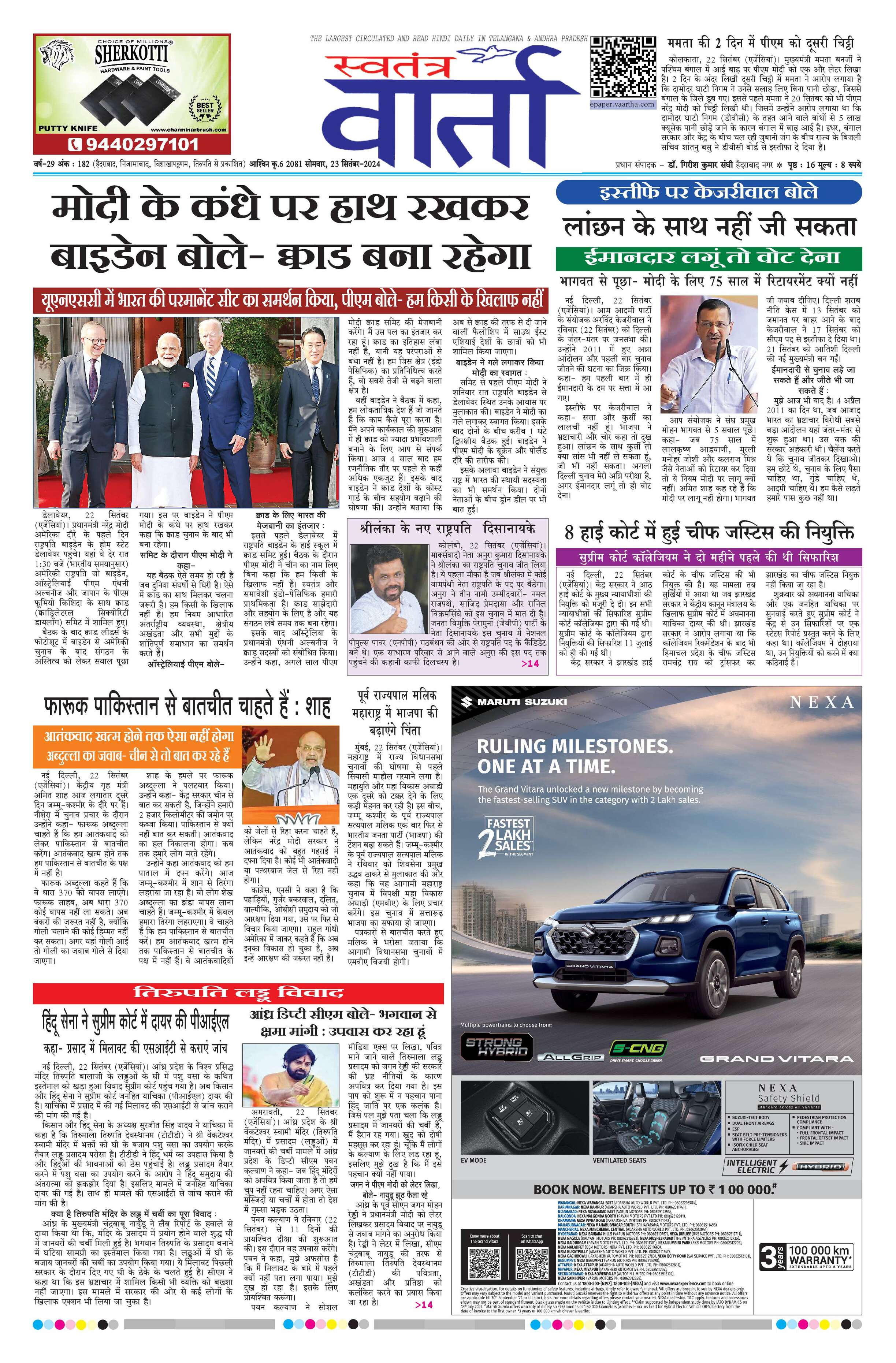 Swatantra Vaartha - 23 Sep 2024 - - Page 1