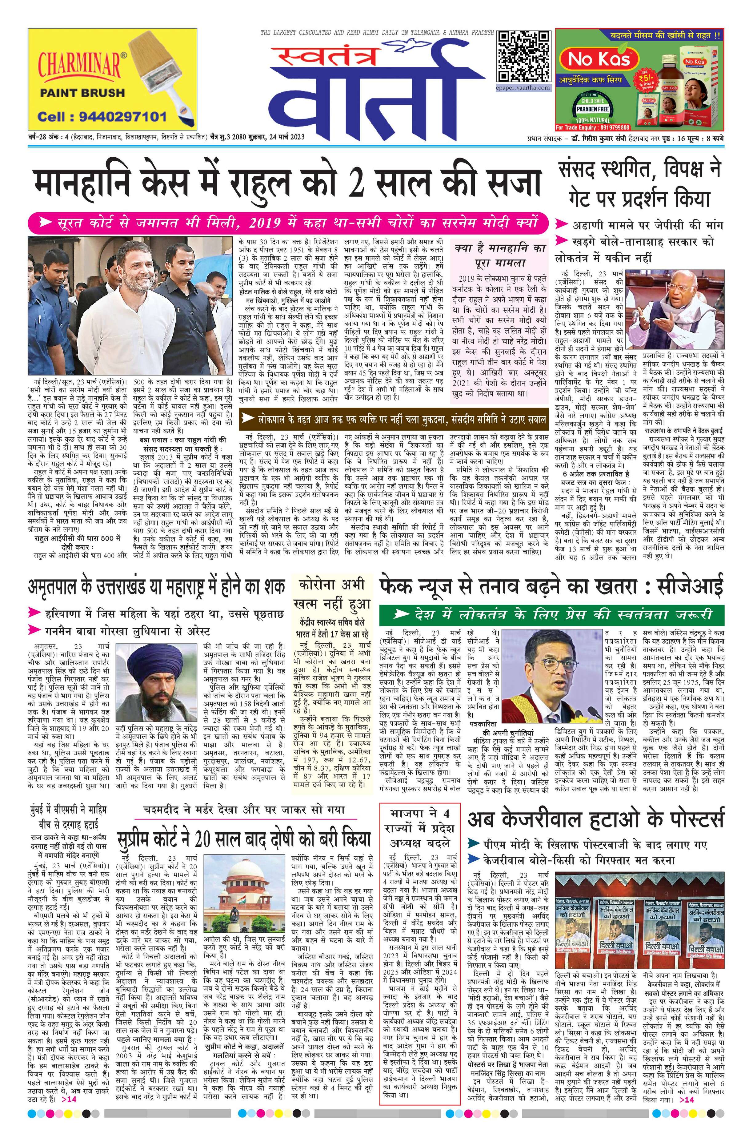 Swatantra Vaartha - 24 Mar 2023 - - Page 1