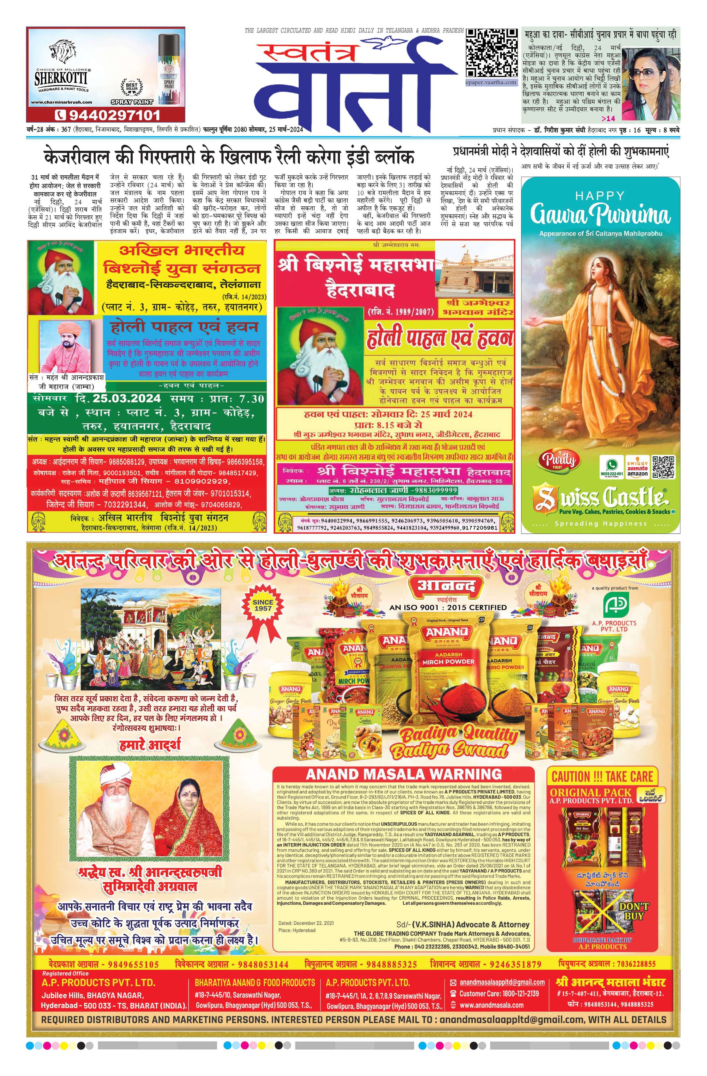 Swatantra Vaartha - 25 Mar 2024 - - Page 1